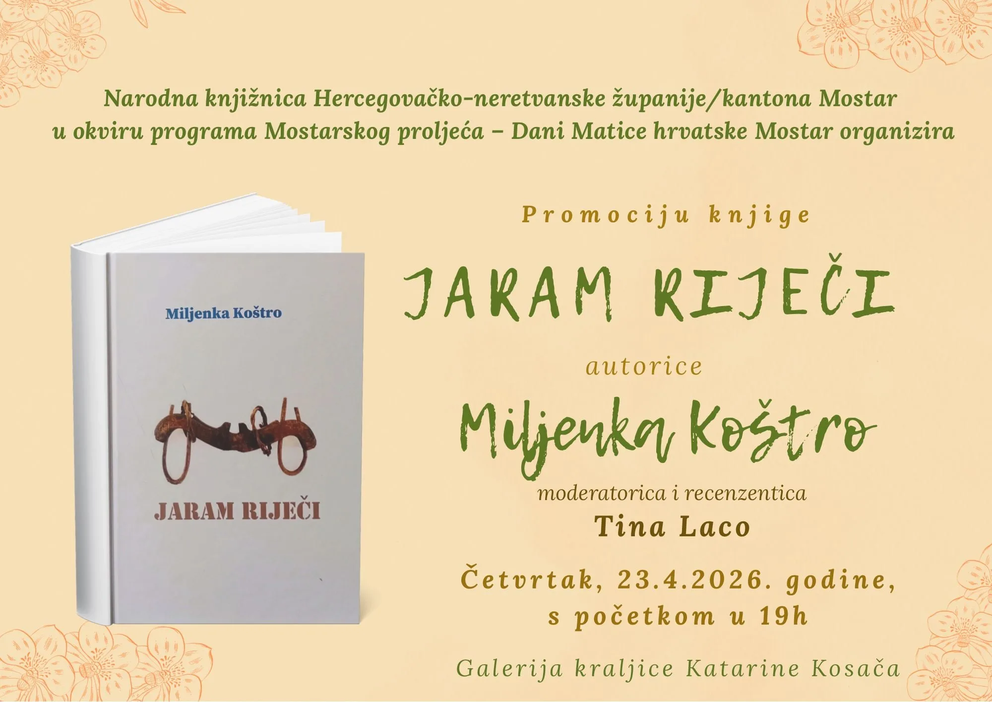Prvi od njih ugostit će Galerija kraljice Katarine u Hrvatskome domu hercega Stjepana Kosače u četvrtak 23. travnja u 19 sati, a riječ je o predstavljanju knjige Miljenke Koštro Jaram riječi. Moderatorica, koja je, uz Mariju Pavković, i recenzentica knjige, je Tina Laco, a program se organizira u suradnji s Narodnom knjižnicom HNŽ-a.