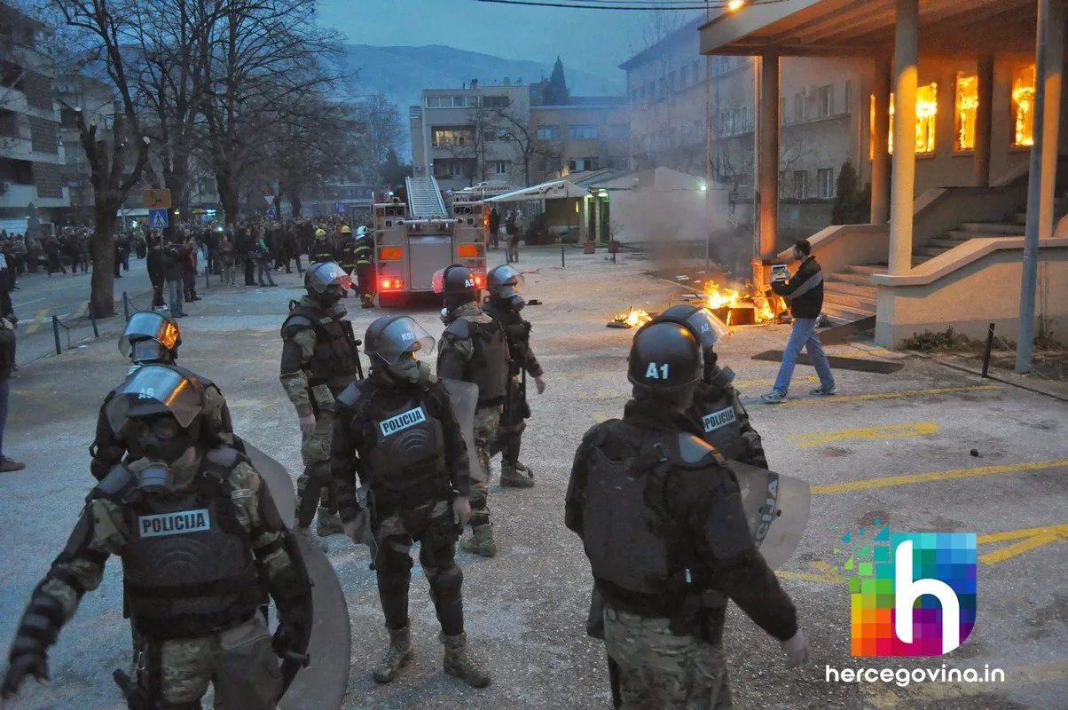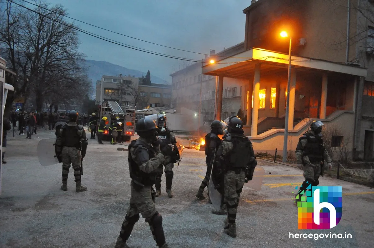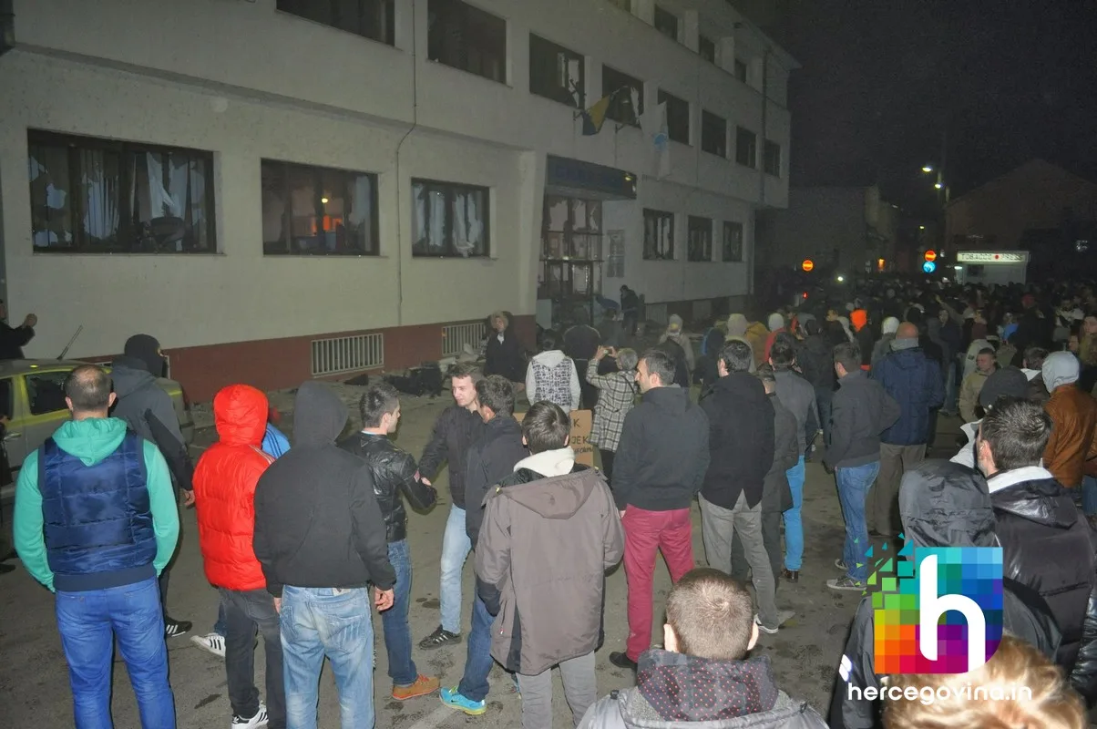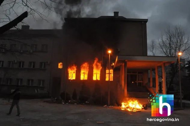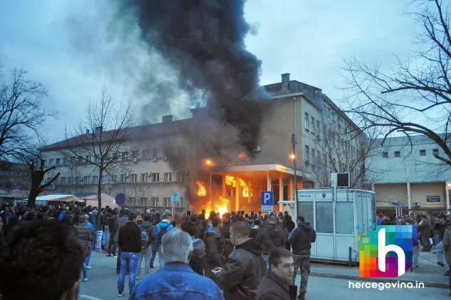 Prosvjednici su zapalili zgradu županijske Hercegovačko-neretvanske vlade, upali u gradsku vijećnicu te su i nju zapalili. Zapaljene su i zgrade HDZ-a BiH i SDA BiH.