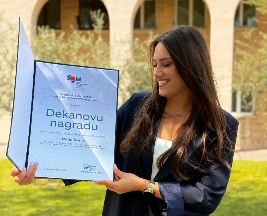 Matea Tomić, studentica pete godine Fakulteta zdravstvenih studija Sveučilišta u Mostaru, dobitnica je Dekanove nagrade za najbolje studente u akademskoj 2024./2025. godini.