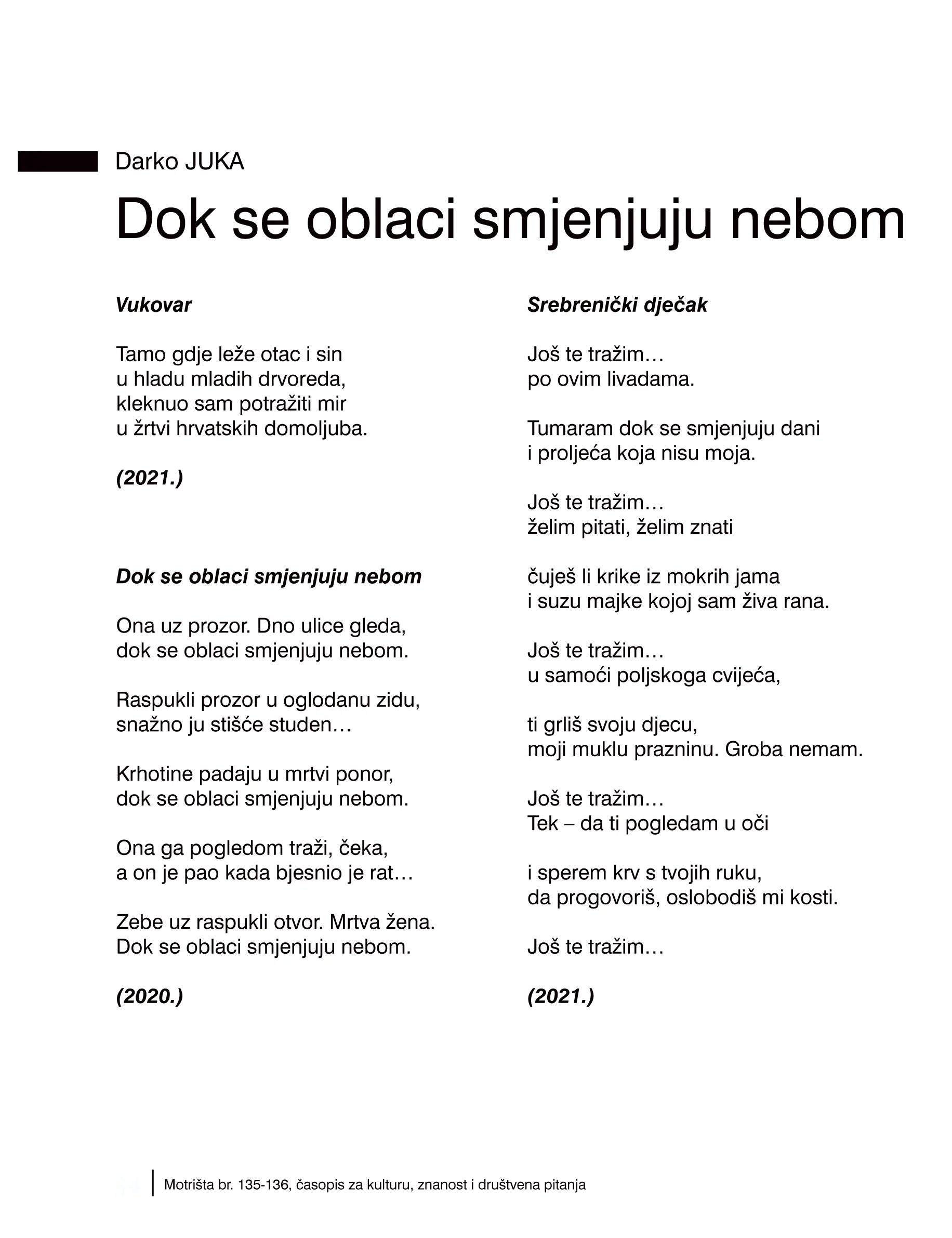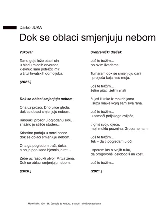 Kratka ali ekspresivna pjesma ”Vukovar” u tek četiri stiha rasplamsava plamen živog domoljubnog ushita, spajajući emociju dubokoga pijeteta prema žrtvi oca i sina (Blage i Roberta Zadre) u kojoj Juka, ”tamo gdje leže otac i sin”, personificira žrtvu svih ubijenih vukovarskih očeva, majki, kćeri i sinova, crpeći iz nje zanos uzvišene predanosti Hrvatskoj u uvjetima i rata i mira.Pjesma ”Dok se oblaci smjenjuju nebom”, čijim je imenom nazvan čitav ovaj pjesnikov opus, tka lik nje koja čeka na njega koji je pao, a ona može biti i majkom i suprugom i djevojkom i kćerkom, suobličujući se s likom svake izmučene žene koja je čekala na ratnika koji se nije vratio.