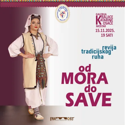 Peta revija tradicijskog ruha pod simboličnim nazivom „Od mora do Save“, u organizaciji Hrvatskog kulturno-umjetničkog društva „Sv. Ante – Cim“ Mostar i udruge FRAMOST – Misije poveznice baštine ljudi i prostora, održat će se u subotu, 15. studenoga, s početkom u 19 sati u Galeriji kraljice Katarine Kosače u Mostaru.