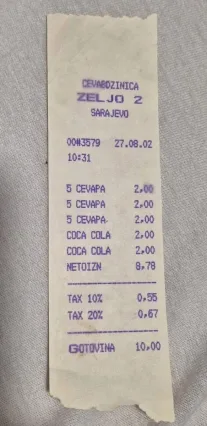 Na računu iz Ćevabdžinice Željo, koji je iznosio 10 maraka, moglo se kupiti tri porcije ćevapa i dvije Coca-Cole.