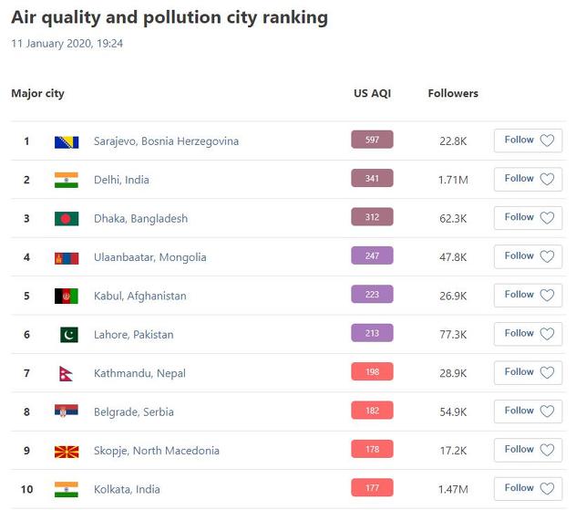 Sarajevo je i u subotu, drugi dan za redom, bilo na vrhu popisa gradova svijeta u kojima je zabilježen najveći stupanj onečišćenja, podatak je dostupan na mrežnim stranicama AirVisual-a koji prikuplja podatke s mjernih postaja sa svih kontinenata.