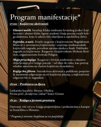 U segmentu „Moja prva knjiga“ publika će imati priliku čuti iskustvo mladog autora o procesu nastanka prve zbirke poezije, dok će interaktivna aktivnost „Knjige bez filtera“ uključiti posjetitelje kroz anonimne književne odgovore i simbolične nagrade za najkreativnije sudionike.
