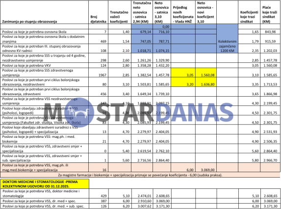Uvidom u tabelarni prikaz neto plaća zdravstvenih radnika, bez uračunatog toplog obroka i naknade za prijevoz, jasno su vidljivi iznosi osnovnih plaća, omjeri između pojedinih kategorija te razlika između ponude Vlade i zahtjeva sindikata.